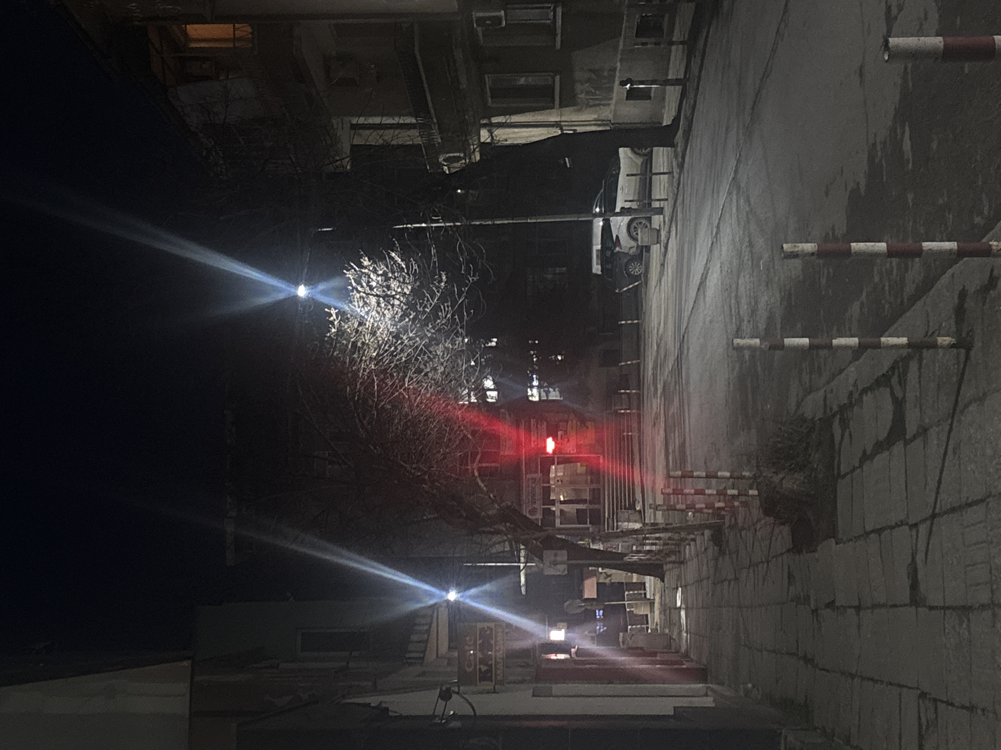 This image depicts an urban nighttime scene, likely within the city of Shumen, Bulgaria, based on architectural cues and general aesthetics. The perspective is angled, presenting a view along a street lined with multi-story buildings. The buildings exhibit a mix of residential and commercial characteristics, with visible windows and signage. Street lighting is prevalent, with intense points of light radiating outwards. A tree, largely bare of leaves, is situated near one of the light sources. A red traffic signal is visible further down the street. Parked cars are present. A barrier marked with alternating red and white stripes runs along the side of the road. The overall environment is dark and appears to be wet, reflecting light. No people are directly visible in the scene.