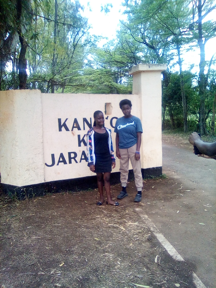The image displays two young individuals posing outdoors in front of a light-colored concrete wall featuring partially visible black text that reads "KANTO K JARAR." An adjacent light-colored pillar stands to the right of the wall. This scene is located in West Sakwa ward, Kenya. The person on the left, appearing young and dark-skinned with dark hair, stands facing the camera, smiling slightly. She wears a black sleeveless top or dress under an open, long-sleeved jacket with a white and blue pattern, and light-colored flat shoes. The person on the right, also appearing young and dark-skinned with short dark curly hair, stands slightly behind the first individual, facing the camera with a neutral expression. She wears a dark blue t-shirt with "Cleveland" printed in white script, light brown or beige jogger-style trousers, dark socks, and dark athletic shoes. A blue wristband is visible on her right wrist. To the far right of the frame, a dark-skinned arm and hand are visible, holding a black smartphone, indicating a third individual is actively capturing the photograph. The ground beneath the subjects is composed of bare earth with scattered dry vegetation. To the right, a path or road surface is visible, featuring a partial white painted line. The background is dominated by a dense canopy of various green-leafed trees under an overcast or light sky.