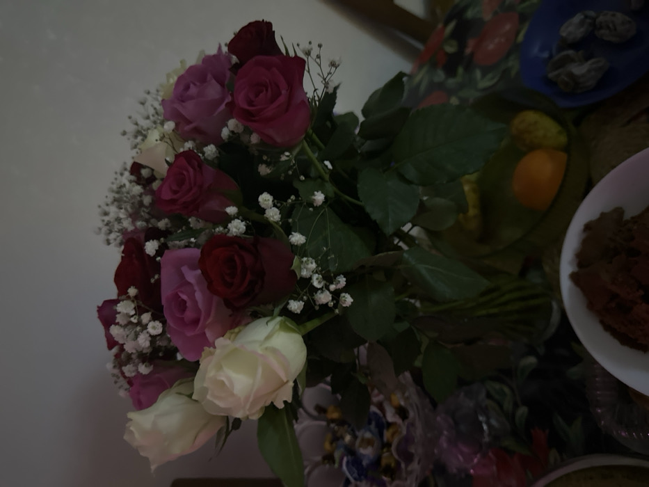 A dimly lit still life features a bouquet of roses in various shades of pink, red, and white, complemented by sprigs of baby's breath. The bouquet is partially obscuring a table setting that includes a plate of dates, a dish with orange and yellow fruits, and a white bowl filled with dark-colored food. A floral-patterned tablecloth is partially visible.