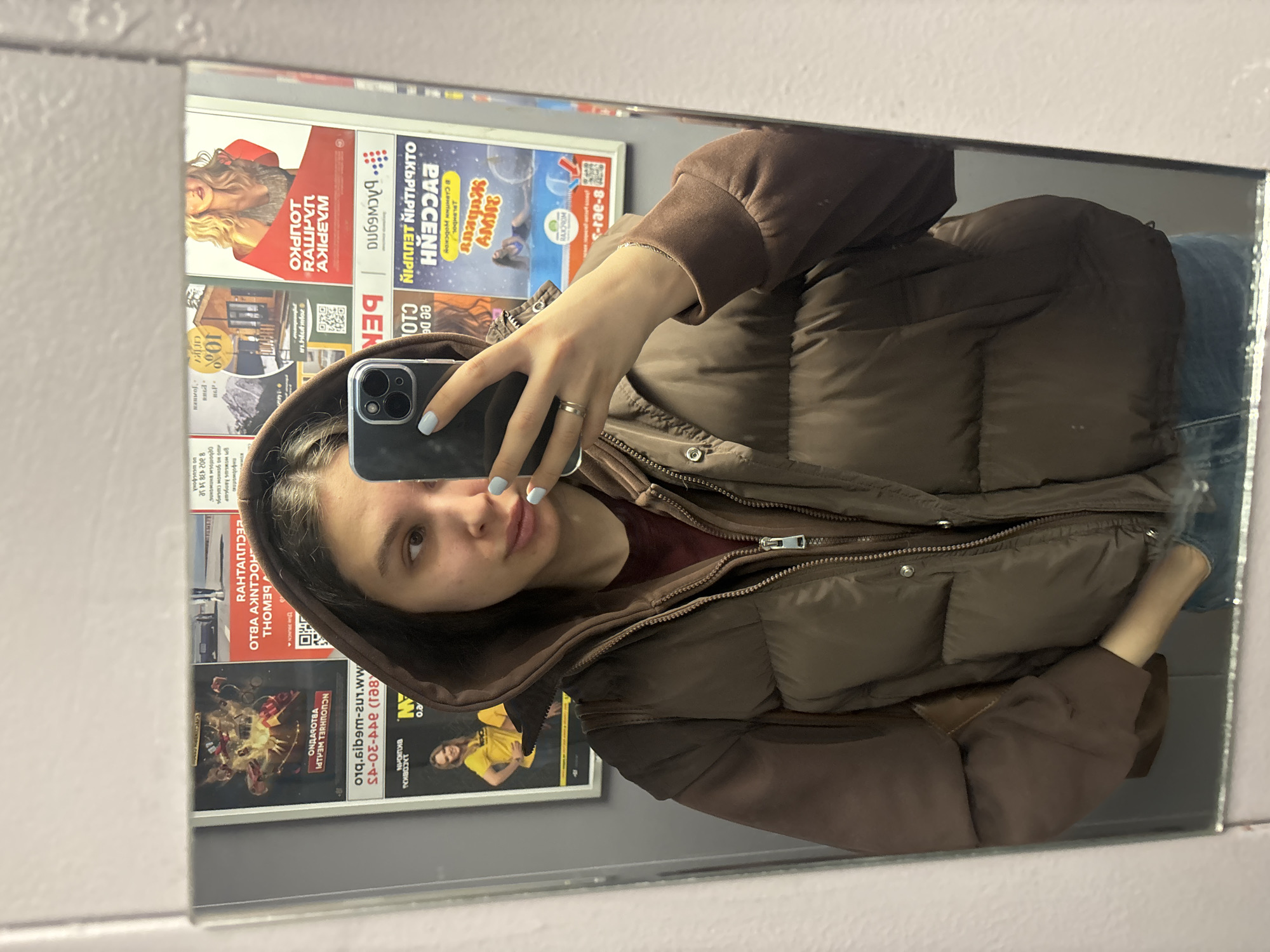 A young adult female is depicted in a mirror selfie taken indoors in Krasnodar, Russia. She is positioned centrally, wearing a brown hooded puffer jacket over a dark red inner layer, with blue jeans partially visible. Her right hand, adorned with light blue nail polish and a silver-colored ring on the ring finger, holds a dark-colored smartphone with a triple-lens camera system, capturing her reflection. Her left hand is partially tucked into her jacket pocket. The background, reflected behind her in the mirror, is a light gray wall covered with numerous commercial and informational posters. These posters predominantly feature Cyrillic text, including advertisements for a "МЕДИЦИНСКИЙ ЦЕНТР" (Medical Center), an "АВТОШКОЛА" (Driving School), and explicit mentions of "КРАСНОДАР," confirming the city. Other visual elements in the background include QR codes, phone numbers, and various graphics such as a blonde woman, a woman in a yellow shirt, and a swimming pool.