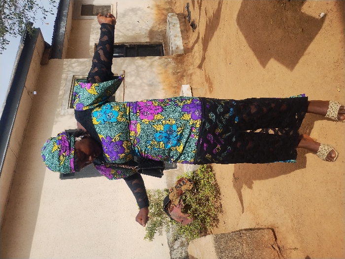 The image depicts an adult female standing outdoors in New Stadium, Nigeria