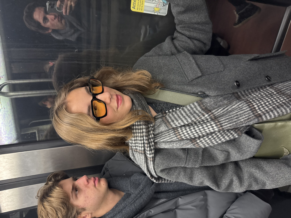 The image captures two individuals inside a Paris Metro train, a service that extends to Neuilly-sur-Seine, France. In the foreground right, a female subject with light brown hair, fair complexion, and pink lipstick wears black-framed glasses with orange-tinted lenses, a grey button-up jacket, a grey and brown plaid scarf, and an olive-green cross-body bag featuring a metallic wing emblem. She gazes to her right with a subtle smile, her right hand positioned near a yellow and white French safety sticker on the train window/door, which depicts a warning against door-related hazards. To her left and slightly behind her, a male subject with light brown hair and mild facial blemishes wears a grey puffer jacket and a grey ribbed scarf, looking to his right with a neutral expression. A reflection in the dark window to the right reveals a third individual, likely the photographer, holding a smartphone and making a puckered facial expression. The train interior features vertical metal poles and highly reflective dark windows.