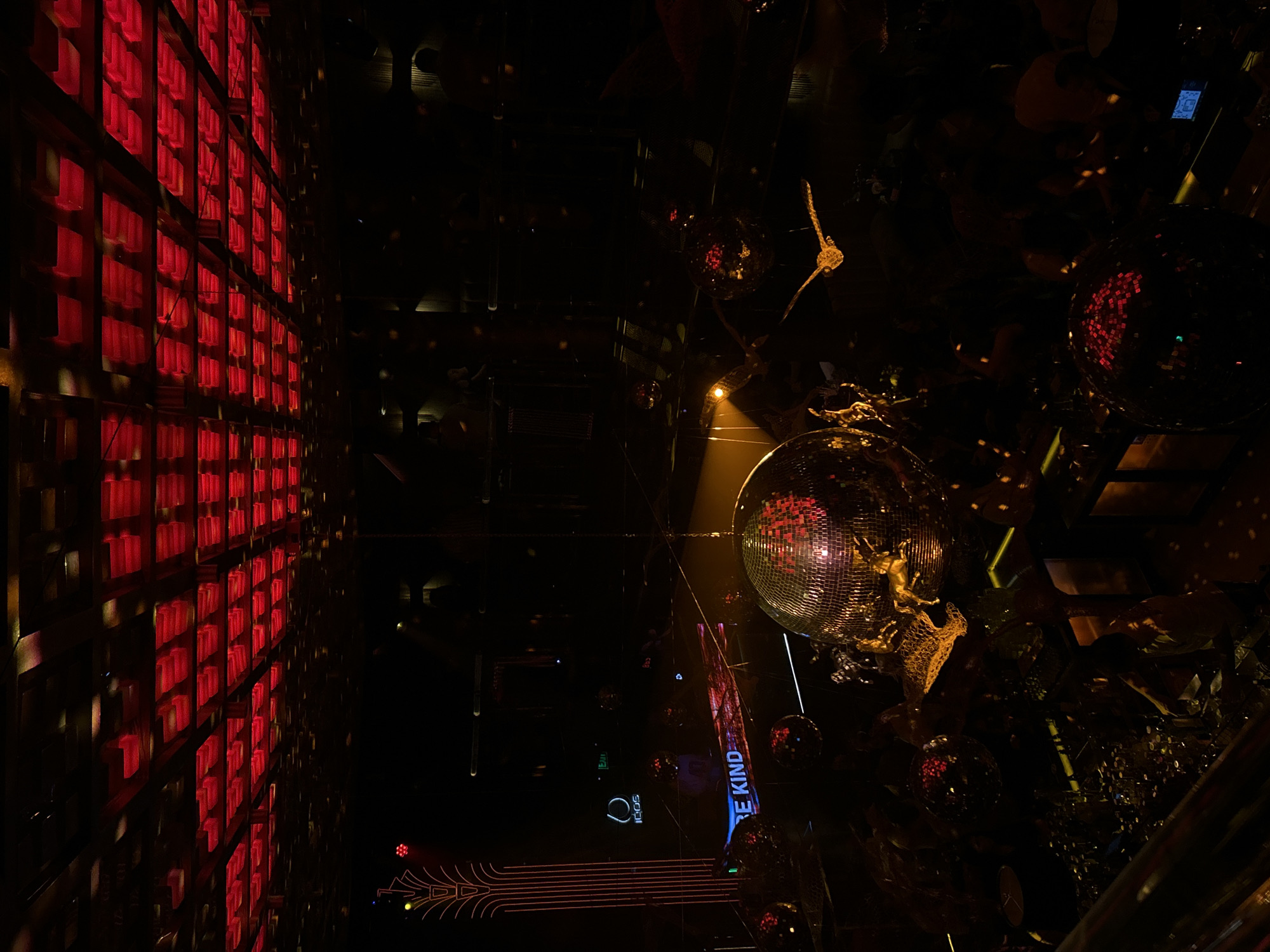 The image depicts an interior scene, likely a bar or club, in Sofia, Bulgaria. A grid-like structure with red lighting is visible on the left side of the frame. Scattered throughout the image are several disco balls of varying sizes, some adorned with golden figures. There are signs that say "Be Kind" and "Nicos". The overall lighting is dim, creating a dark and atmospheric mood.