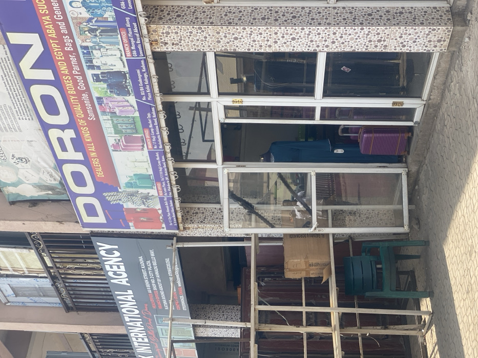 This image depicts a daytime street scene in Shaba, Nigeria, featuring the ground floor storefronts of two adjacent commercial establishments