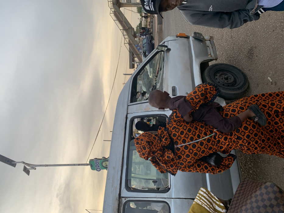 A woman in a colorful orange and black patterned dress is carrying a child on her back. They stand beside a white van with visible damage to the windshield and body. A man wearing a gray sweatshirt and a black hat is partially visible in the upper right corner. In the background, a pedestrian bridge is visible under a cloudy sky. A pole with an "OPay" sign is positioned near the van's roof. Luggage is visible at the bottom right of the frame.