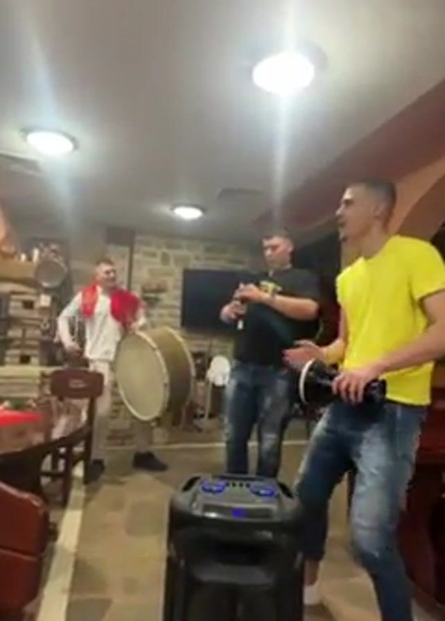 Three young men are enjoying themselves in a room that seems to be part of a restaurant or a home with a rustic feel. One man, dressed in a white shirt and light pants with a red scarf, is playing a large drum. Another man, wearing a dark shirt and jeans, is playing what appears to be a bagpipe. The third man, in a bright yellow shirt and ripped jeans, is dancing and playing a smaller drum. A large speaker sits in the foreground, likely providing music to which they are playing along. The room has stone walls, a fireplace with a roaring fire, wooden furniture, and is well-lit by ceiling lights. They appear to be having fun, energized by the music.