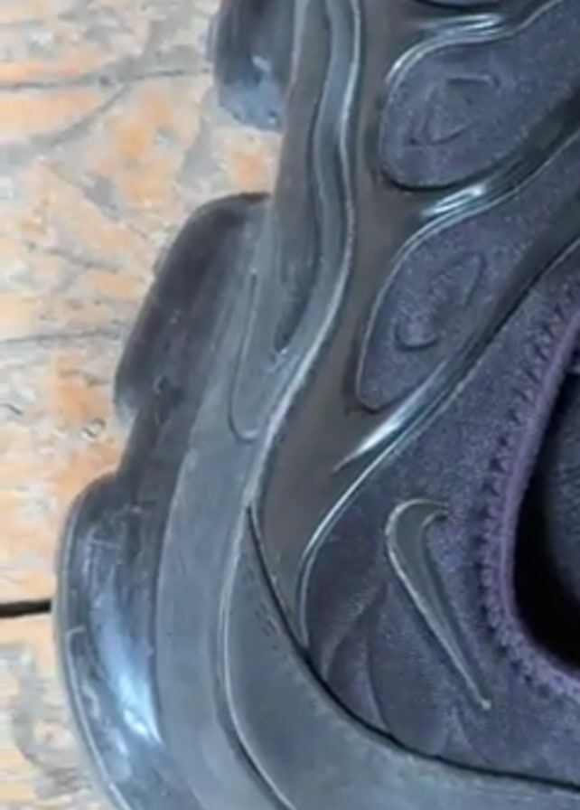 close-up of a black Nike Air Max Plus sneaker on a foot, which is clad in black jeans