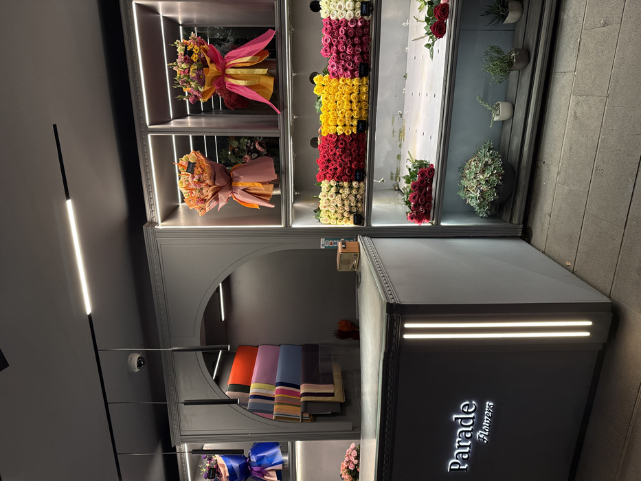 The image depicts the interior or storefront view of "Parade Flowers," a flower shop located in Yerevan, Armenia