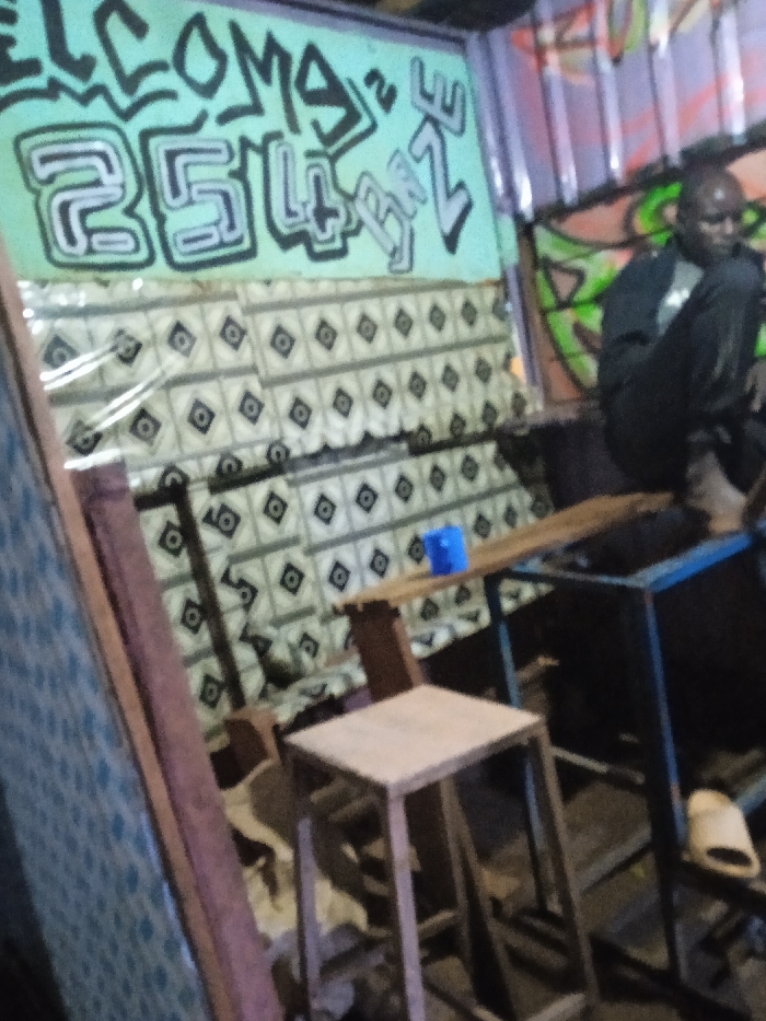 The interior of a modest space shows a man sitting on a makeshift counter with metal framing. Graffiti adorns the wall above patterned fabric. A small, square, wooden stool sits in the foreground, and a blue container rests on the counter. A sandal lies on the ground. The scene appears informal and lived-in.