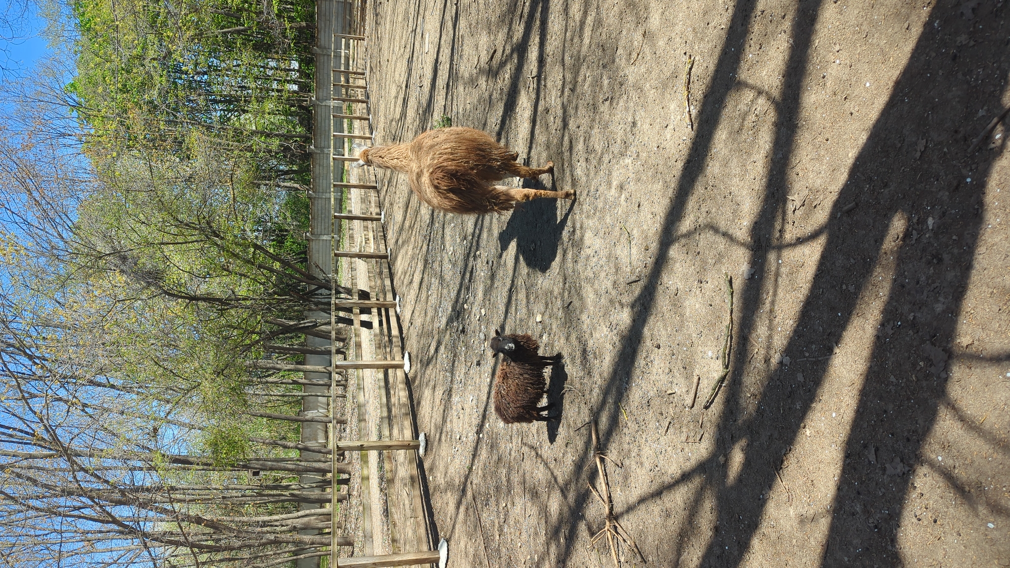 n outdoor enclosure with a light brown llama and a dark brown sheep. The ground is dirt and there are shadows from trees overhead. A low wooden fence lines the left side of the enclosure. Trees with green leaves are visible beyond the fence. The location is in the city of Unknown, Unknown.