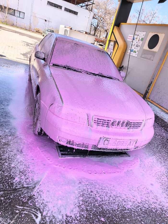 - "An Audi A4 (B5 generation) sedan, appearing silver or light grey underneath a layer of vibrant pink car wash foam, is positioned centrally within a self-service car wash bay in Plovdiv, Bulgaria" by FM-0lwZK2, licensed under CC BY 4.0
