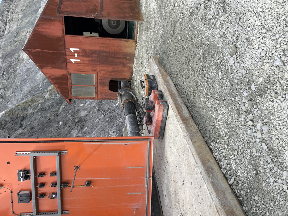 The scene depicts an industrial or utility installation in Oborishte, Bulgaria, set against a rocky mountain backdrop. In the foreground, a light grey gravel ground transitions to a raised concrete slab. Positioned on the left side of the slab is an open, bright orange metal electrical cabinet, revealing an internal panel equipped with multiple black electrical switches, relays, and associated wiring mounted on a metal framework. Adjacent to the orange cabinet on the concrete slab are work tools: two red and black battery packs, a black and red cordless impact wrench, and a small black and yellow toolbox. To the right, a weathered, rusty red utility building with a gabled roof stands. The designation "1-1" is stenciled in white on its side. The building features a rectangular window on its left side and an open door on its right, through which a large, circular piece of machinery, possibly a pump or generator, is partially visible. A substantial black pipeline emerges from a small arched opening near the base of the red building, extends horizontally, and incorporates a prominent valve assembly before continuing towards the left, partially obscured. Several smaller black hoses or cables are intertwined with the main pipeline. The background is dominated by a steep, rocky, light grey mountain face. No individuals are present in the scene.