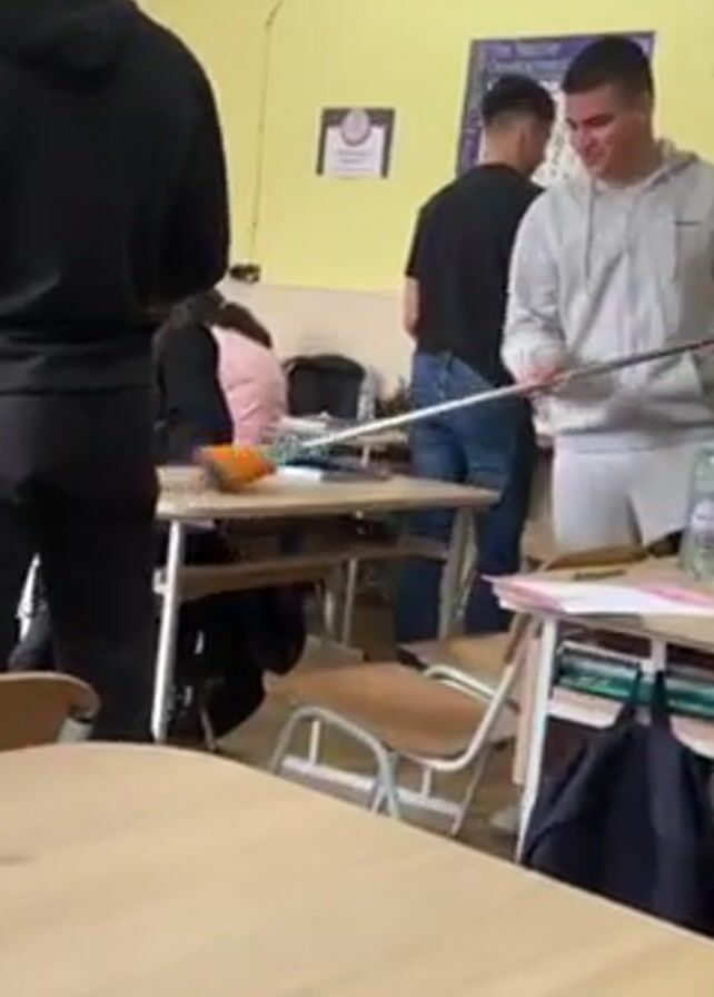 interior of a classroom. Several students are standing around desks, some holding long, metal poles. One student, wearing a gray hoodie, is holding a pole and smiling, while another student in a black sweatshirt is manipulating a cleaning device at the end of a pole, possibly a vacuum cleaner attachment. The classroom has yellow walls, several windows, and posters on the walls. Desks are wooden with metal frames. The overall atmosphere appears to be informal and somewhat chaotic.