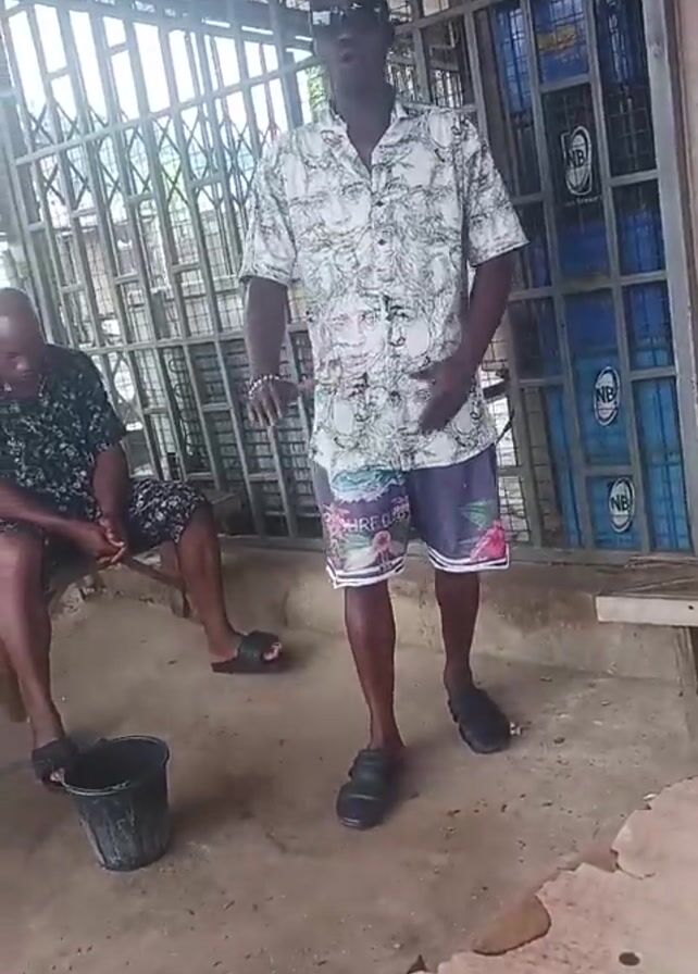 A man in sunglasses, a short-sleeved button-up shirt, shorts, and sandals is standing and talking, gesturing with his hands. He is standing on a dirt surface under a sheltered area with a metal barred structure behind him. To his left, another man is seated on a bench, also wearing shorts and sandals. A black bucket is on the ground near the seated man. There's also a wooden bench behind the standing man. Blue crates with "NB" logos are stacked behind the metal bars.