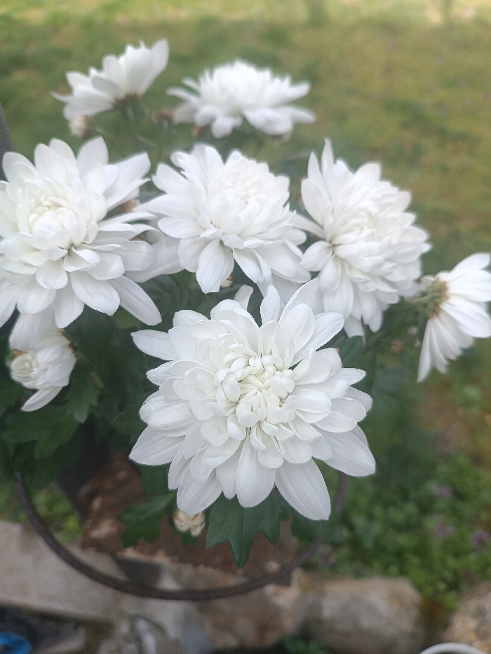 The scene depicts a potted arrangement of white chrysanthemum flowers outdoors in the city of Kulata, Bulgaria. The image foreground is dominated by multiple fully bloomed white chrysanthemums, characterized by dense, layered petals. A large, central flower is sharply focused. Additional white blooms and smaller, emerging buds are visible amongst dark green leaves and stems. The plant is contained within a dark-colored pot, partially visible at the lower left. A dark, curved metallic object, consistent with a stand or support ring, is present around the base of the pot. The background is a blurred expanse of green grass or low-lying vegetation, suggesting a garden or yard environment, with natural daylight providing illumination.