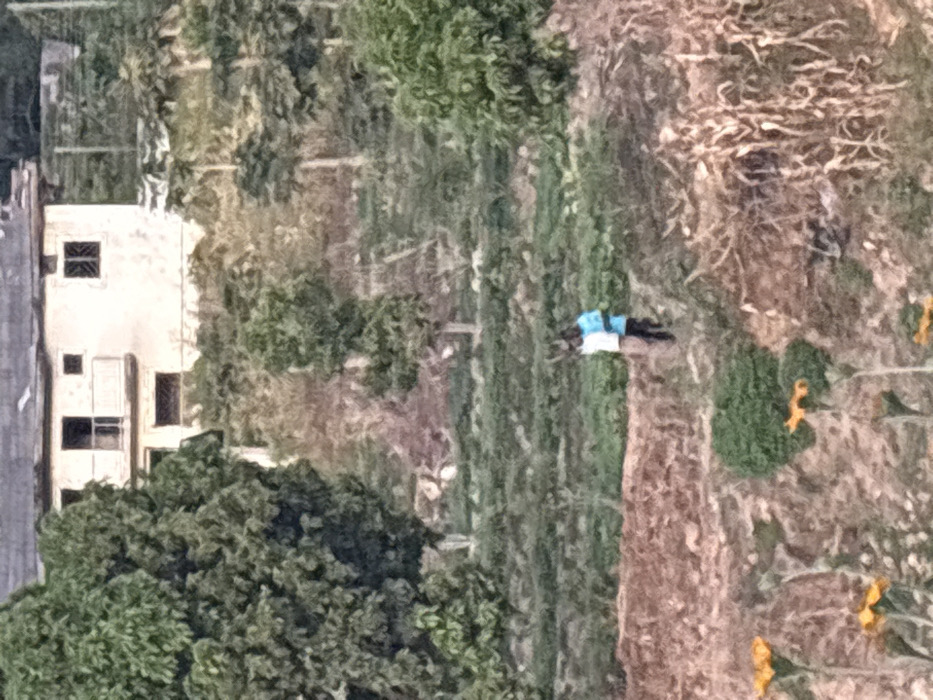 The image captures an outdoor scene in Jos, Nigeria, featuring a sloped, semi-cultivated landscape under natural daylight. In the upper background, a light-colored, multi-story building, likely residential, is partially visible, featuring dark-paned windows and a balcony. This structure is set against a backdrop of distant trees and a darker, less defined horizon. The midground comprises a verdant slope covered with cultivated green vegetation, possibly agricultural fields, interspersed with scattered trees of varying sizes. In the lower midground, two individuals are standing on a reddish-brown earthen path or embankment. The person on the left wears a light-colored (possibly white or light blue) top and dark trousers, while the person on the right wears a blue top and dark trousers; they are positioned closely together. The foreground consists of disturbed, reddish-brown earth, with dry, pale stalks of vegetation on the right and out-of-focus yellow-orange flowers in the bottom left.
