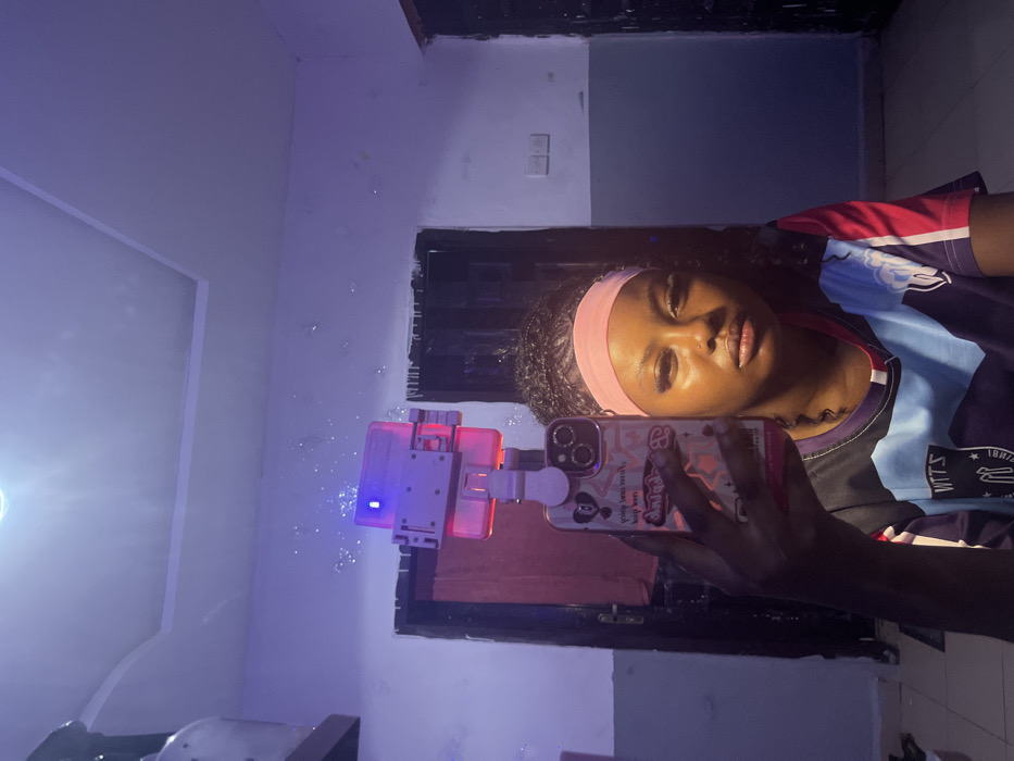 A person poses in a mirror selfie. They wear a pink headband and a sports jersey with blue, black, and red. A phone in a decorative case is held up, reflecting in the mirror. To the left, a device emits a blue light and generates bubbles that are caught in the light. The room's walls are painted in shades of white and light blue. An opening in the wall, possibly a window or door frame, is visible behind them.