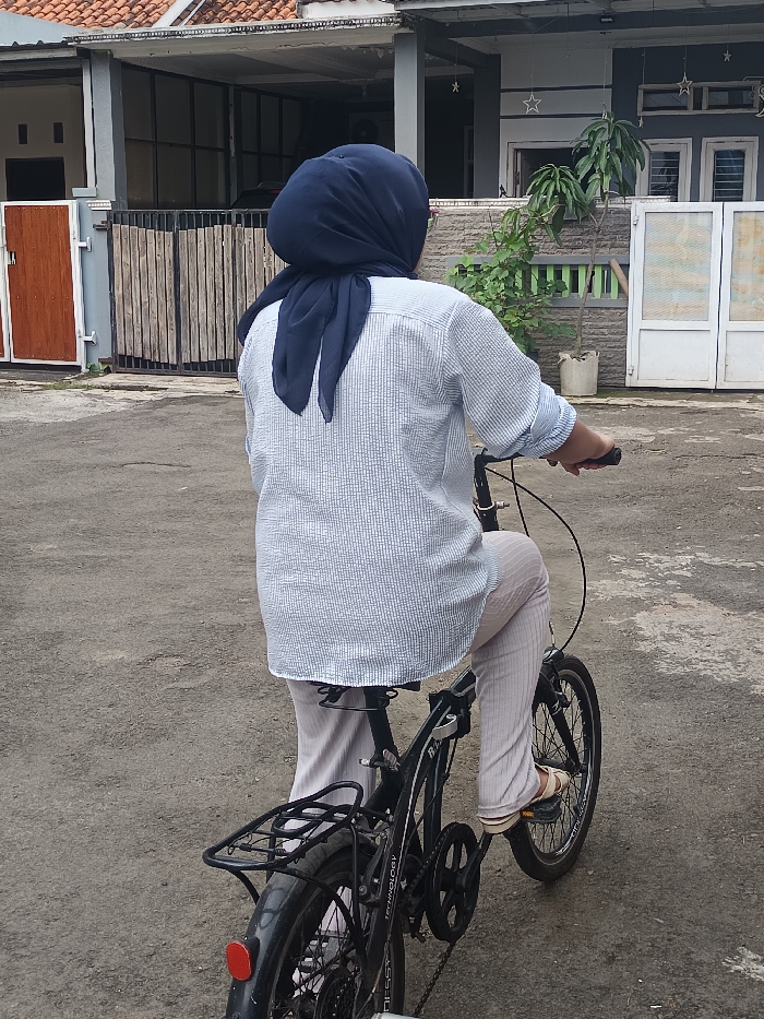 A person wearing a dark blue headscarf, a light-colored, horizontally striped shirt, and light-colored pants is riding a black folding bicycle. The person is seen from the rear. The bike has a small luggage rack over the back tire. The scene takes place on a paved road in front of houses, which are visible in the background with various gates and windows. A small tree in a pot is also visible.