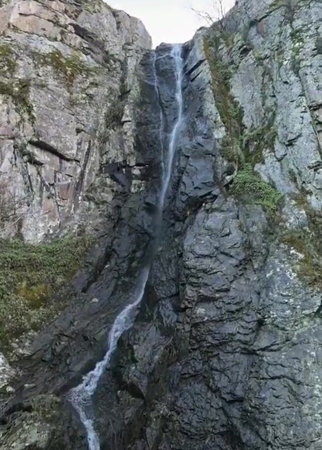 tall, narrow waterfall cascading down a rocky cliff face. The rock is dark gray and covered in patches of moss and small plants. The waterfall is in several sections with the water dispersing and then regrouping as it descends. The sky is visible at the top of the falls, and a few bare branches from trees are visible on either side.