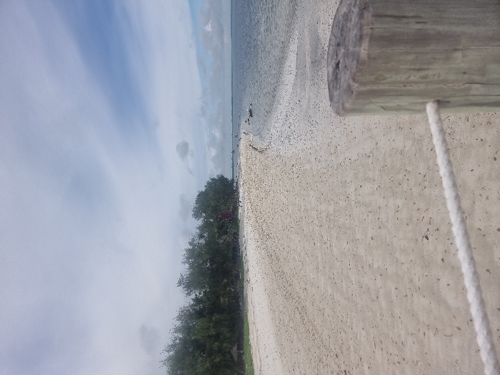 The scene depicts a coastal environment in Michamvi Kae, Tanzania, viewed from a slightly elevated position or structure. In the immediate foreground, a weathered light-colored wooden post, part of a railing, is cropped on the bottom right. A white, braided rope is visible passing horizontally across the bottom of the frame, connected to or extending from the post. The midground features a wide expanse of light-colored sand, heavily dotted with numerous small, dark particles or debris, particularly concentrated towards the waterline. The sandy beach curves gently to the right, meeting calm, dark blue-grey water that extends towards the horizon. Along the immediate waterline, additional small, dark debris is scattered both on the sand and partially submerged. On the left side of the frame, a dense line of green trees and foliage borders the beach, extending into the background. A small, dark structure with a sloped roof is partially visible within the trees on the far left. The sky overhead is largely overcast with scattered grey and white clouds, though patches of lighter blue are visible towards the right horizon. No human figures or active subjects are present in the frame.