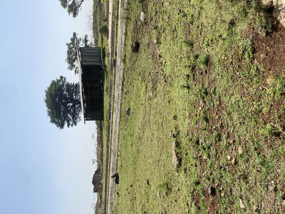 A landscape scene under a clear sky, featuring a weathered shed structure nestled between trees and lush green grass. Adjacent to the shed, stone or concrete slabs form a pathway. The ground is a mixture of grass and bare soil. The shed has a metal frame.