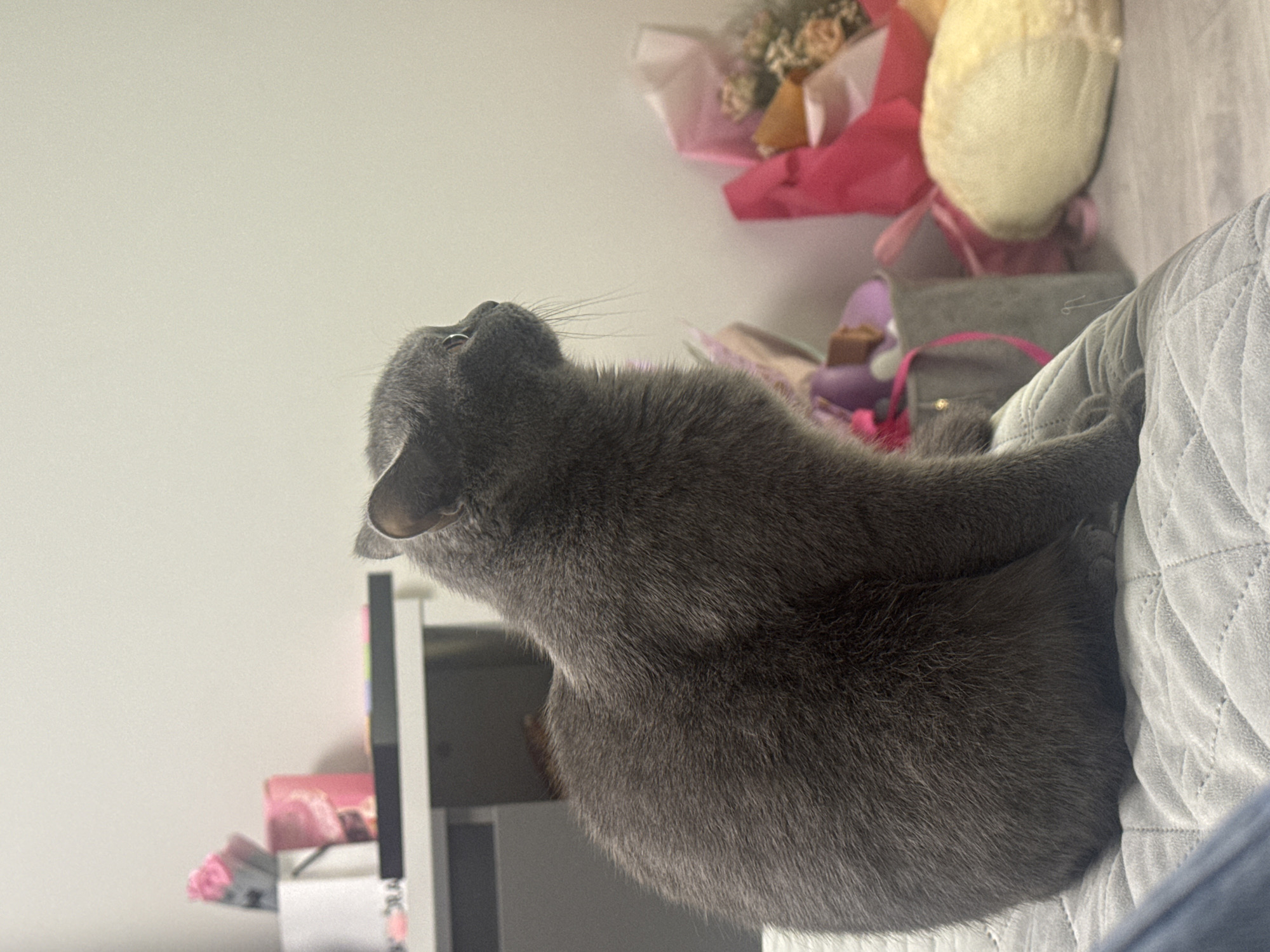 The image depicts an indoor scene located in Dimitrovgrad, Bulgaria. A domestic shorthair cat with solid gray fur is seated upright in profile on a light gray, quilted textile surface, occupying the lower-left portion of the frame. The cat faces towards the right, its head slightly turned, appearing to observe an area beyond the right edge of the frame. Its right ear, right eye, and whiskers are clearly visible. The background consists of a plain, light-colored wall. To the left, a light-toned piece of furniture supports a white cylindrical object, a pink cylindrical object, and a black rectangular tray containing multiple colorful items. To the right, on a light-colored surface, a bouquet of flowers wrapped in bright pink paper is present, alongside a light gray bag with a pink strap, and a large, pale yellow, ovate object resting on the floor or a lower surface.