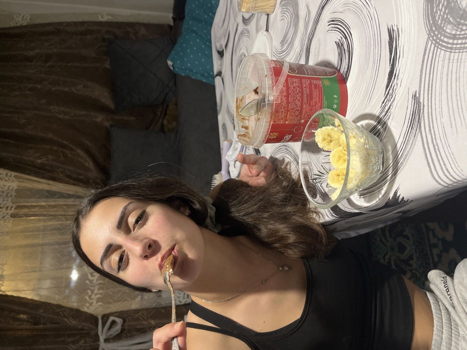An indoor scene in Lozarevo, Bulgaria, depicts a young adult female seated at a table, consuming food. The female, positioned off-center to the left, has long, dark brown hair and is wearing a black tank top and grey sweatpants. A silver-colored spoon, holding a dark brown substance consistent with chocolate spread, is at her mouth. She wears a silver chain necklace with a small pendant. On the table in front of her is a white tablecloth with a swirling grey pattern. Objects on the table include a large, translucent plastic container with a red label, identified as "Nuova" chocolate spread, which has a spoon resting inside it. Adjacent to this, a clear glass bowl contains several slices of peeled banana. A small cluster of toothpicks is also visible on the table's right edge. The background shows dark brown curtains with a subtle pattern. Below the curtains, a sofa or bench is visible, furnished with dark grey and a single turquoise patterned cushion. The floor features a dark patterned rug. The lighting in the room is artificial and appears warm.