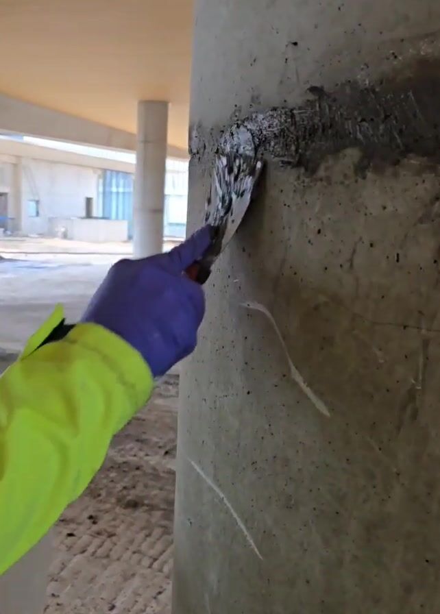 person repairing a concrete column. The person is wearing blue gloves and a yellow and black reflective safety jacket. The person is applying a dark gray cement-like material with a small trowel to a horizontal crack in the column, blending the material into the surrounding concrete. The column is cylindrical and light gray. The trowel has a red handle and is covered in the gray material. The background is a construction site with other columns visible and a building with windows in the distance. The lighting is a combination of natural and artificial. The column is partially shaded.