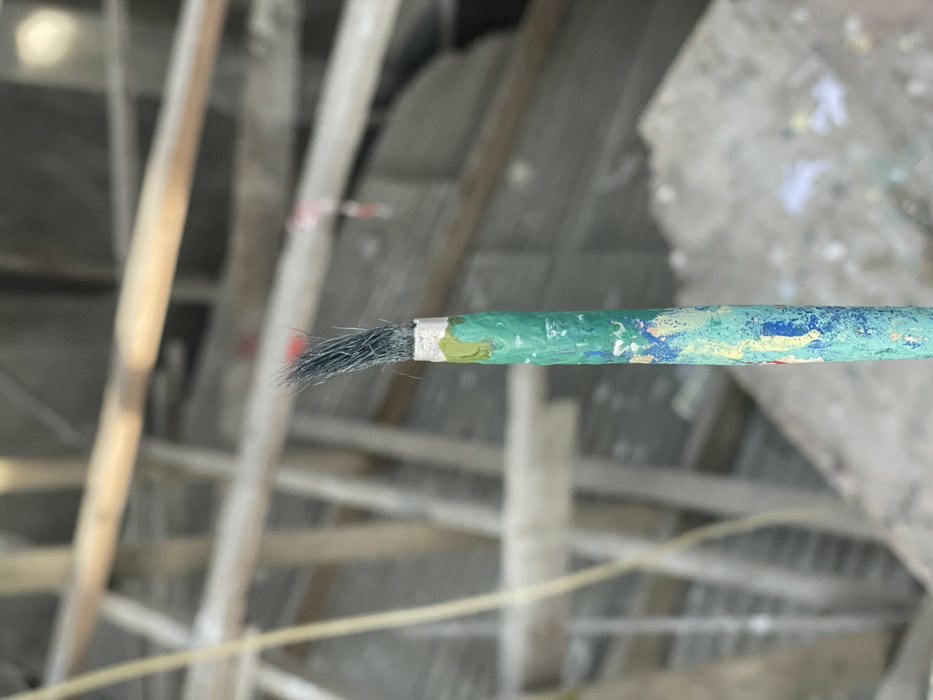 This close-up image portrays a single, well-used paintbrush positioned vertically in the foreground, sharply focused