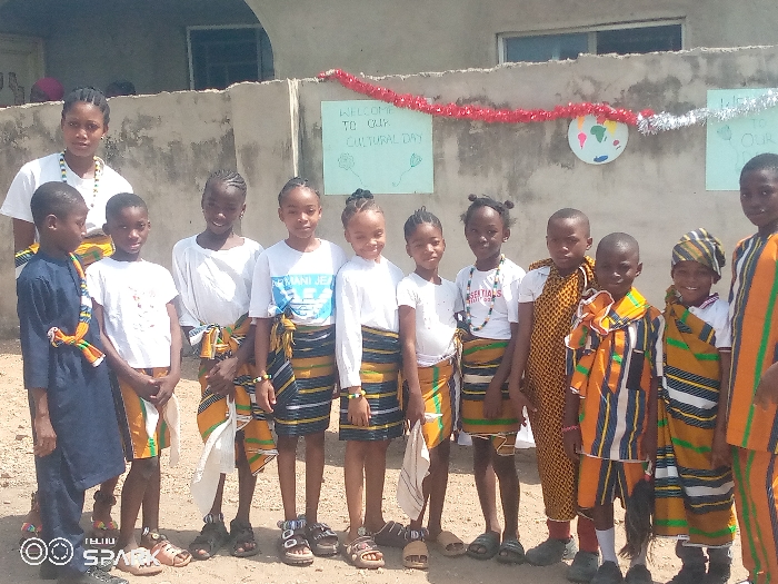 A group of children and a young adult are standing outside in front of a building in Ajaokuta, Nigeria. A sign on the building reads "WELCOME TO OUR CULTURAL DAY". Most of the children are wearing a matching skirt-like garment in yellow, black, and white stripes. Some are also wearing matching tops. One child is wearing a dark blue garment, while others are wearing yellow and orange striped outfits. The young adult is wearing a white shirt and a necklace with colorful beads. They are all standing relatively close together, facing forward.