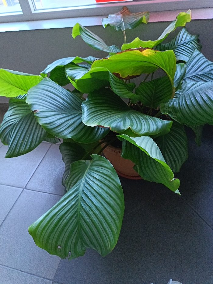 An indoor scene, situated in Gorna Oryahovitsa, Bulgaria, features a large potted plant. The plant exhibits numerous broad, elliptical leaves, characterized by a deep green coloration with distinct, lighter green parallel stripes emanating from the central vein. Some leaf margins show localized browning. The plant is housed in a circular, light-brown terracotta pot, partially visible, with a matching saucer positioned beneath it. It rests on a light grey tiled floor. A plain, light grey wall serves as the background. A white-framed window is partially visible in the upper left, admitting ambient light and showing a faint red reflection near its upper edge. No individuals or dynamic actions are present within the depicted scene.