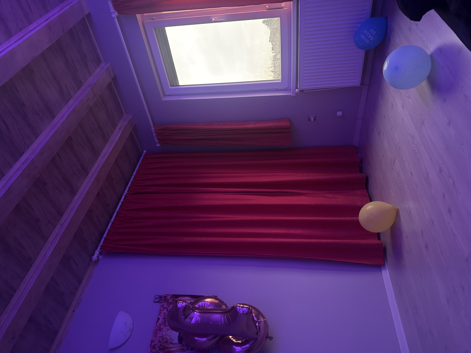 n interior space in Polikraishte, Bulgaria. The room has an attic roof with visible wooden beams. A skylight window is present, covered with snow on the outside. Red curtains hang along a wall. A "50" shaped gold balloon is positioned near a white wall with a floral decorative item, and three other balloons (blue, white and yellow) are seen near the ceiling and adjacent walls. The lighting is predominantly blue/purple.