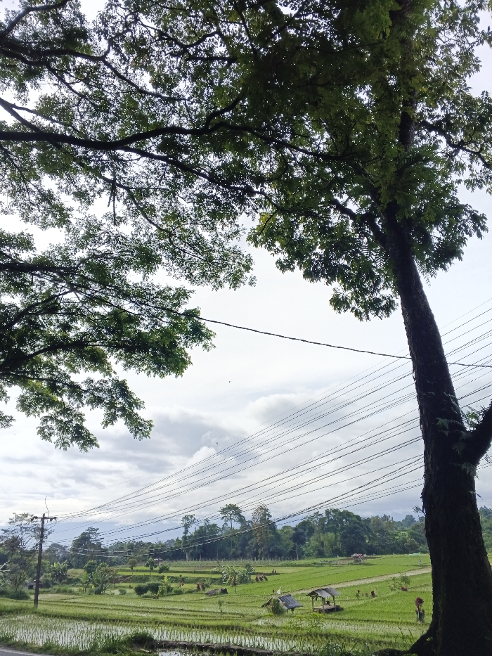 Lush green rice paddies stretch across the landscape, dotted with small structures. A thick canopy of trees frames the top of the scene, their leaves obscuring a cloudy sky. Power lines crisscross the view, contrasting with the natural setting. A large tree trunk stands prominently on the right, its bark dark and textured. The overall impression is one of serene rural life under an overcast sky.