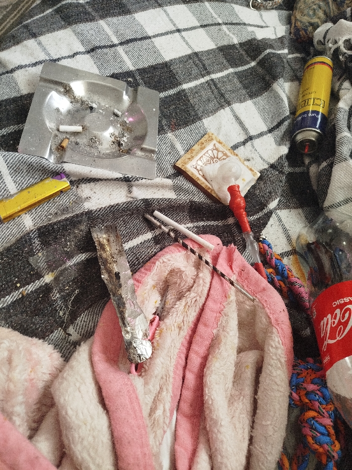 The image displays a close-up, overhead view of various items scattered across a black, white, and gray plaid blanket in Parand, Iran. A dirty metal ashtray, containing cigarette butts and ash, is positioned on the upper left. Adjacent to the ashtray on the right is a yellow disposable lighter. Centrally, an elongated clear glass pipe, wrapped at one end with aluminum foil and exhibiting visible residue, rests on a pink and white fluffy blanket or garment. Several thin white plastic tubes and a single black and white striped straw are located near this pipe. A smaller, bulbous glass pipe with a red-taped section is situated on a small, decorative patterned tile. Towards the upper right, a yellow and blue butane canister labeled "JET butane pure butane" is visible. A plastic Coca-Cola bottle and a multicolored braided cord are also present on the right side of the frame. No individuals are depicted. The arrangement of objects suggests recent or ongoing illicit drug use.