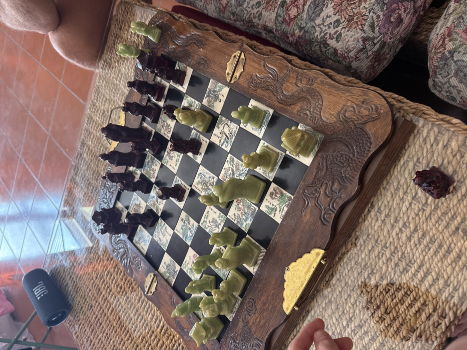 An ornate wooden chess set with Asian-themed carved stone pieces is centrally positioned on a woven straw mat indoors in Cutrofiano, Italy. The chessboard displays alternating black and illustrated light-colored squares, bordered by dark wood featuring carved dragon motifs and accented with brass-colored corner brackets and hinges. One set of chess pieces is light green, while the opposing set is dark reddish-brown; the pieces are arranged mid-game. In the upper left background, a black JBL portable speaker rests on the mat. The floor beyond the mat is composed of large, light brown square tiles. To the right, a section of patterned fabric, likely upholstery or a cushion, is visible alongside a partial view of a human limb. In the lower left foreground, a human hand is present near the chess board, and a single detached dark reddish-brown chess piece lies on the woven mat.