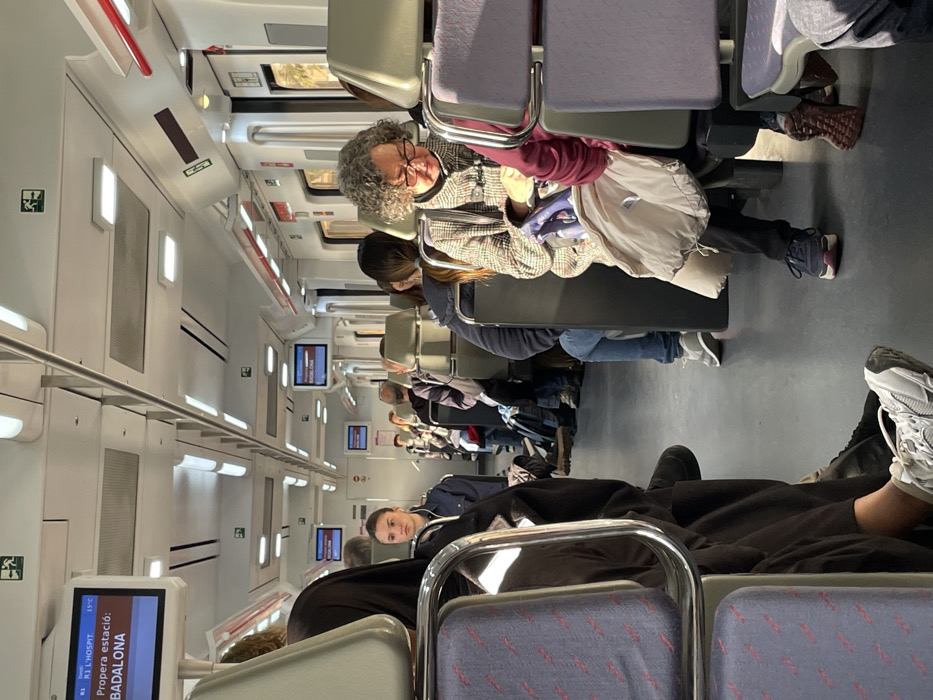 - "The image depicts the interior of a commuter train carriage in Badalona, Spain, as indicated by the digital display screens showing "Propera estació: BADALONA" (Next station: Badalona)" by FM-T5EOT2, licensed under CC BY 4.0