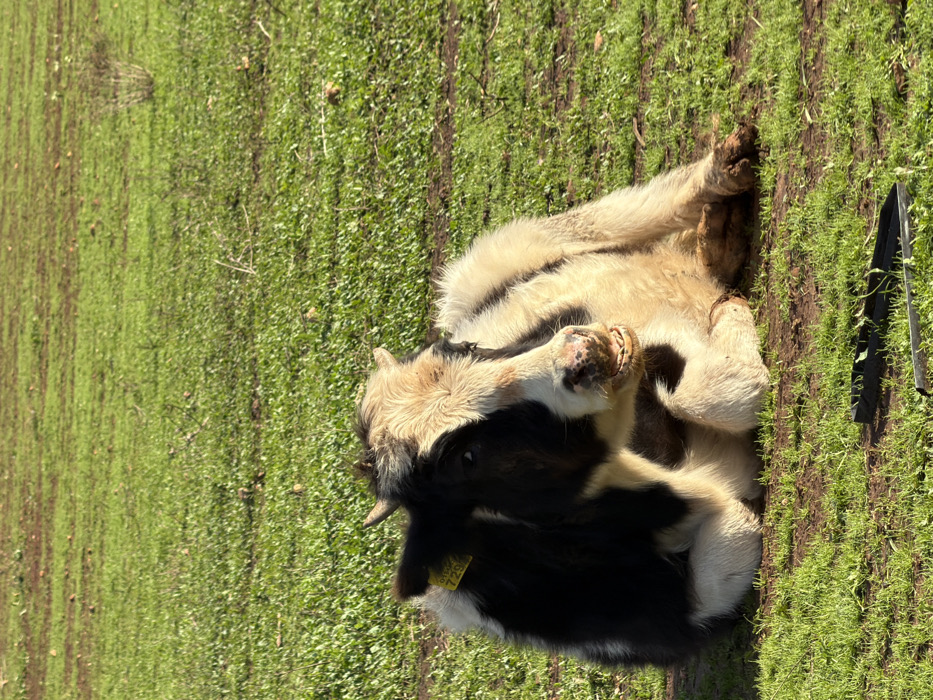 - "A black and white cow lies on its back in a field of green grass" by FM-vA9lX2, licensed under CC BY 4.0