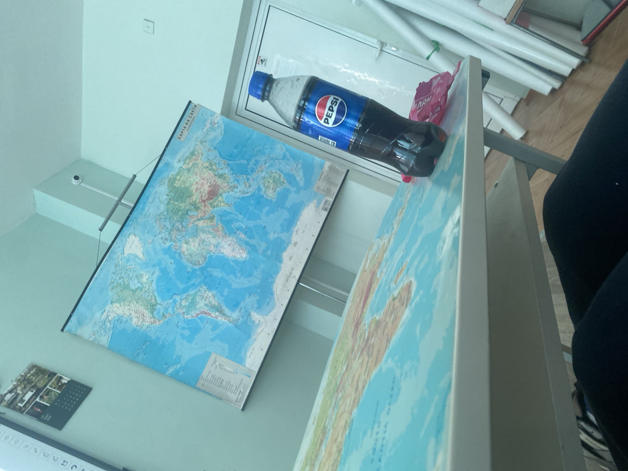 The scene depicts an interior space with several notable elements. On the left, a world map titled "KARTA NA SVETA" (Map of the World) in Bulgarian is mounted on a wall alongside a calendar. Above the map is a security camera. Resting atop what appears to be a table or ledge is a partially consumed bottle of Pepsi, next to a pink item that is hard to identify. In the background, white pipes and other materials are visible. To the right, an individual is partially visible, clad in black clothing. It's impossible to provide an exact location within Veliko Tarnovo, Bulgaria, without further context.