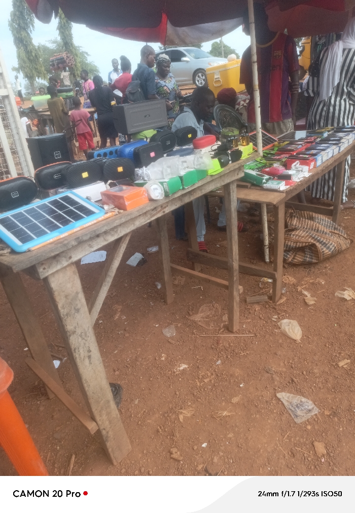 The scene depicts an outdoor market stall in the city of Makurdi, Nigeria, viewed from a low angle. In the foreground and mid-ground, two rustic wooden tables serve as display units, laden with various electronic goods. The left table features a blue-framed solar panel, multiple portable speakers in black, blue, and orange casings, an orange-boxed power bank, and several clear and green-cased flashlights. The right table displays numerous smaller, packaged electronic items. Overhead, a striped red and black tarp provides shade. The ground surface is exposed red earth, strewn with plastic bags and general litter. Behind the left table, a man with dark skin, wearing a light blue collared shirt, is seated, observing the merchandise. Partially visible behind the right table is another individual wearing a black and white striped garment. In the background, numerous people, including adults and children dressed in diverse casual and traditional attire, are present, some appearing to browse goods, others moving through the market area. A silver sedan is visible in the distant background, partially obscured by the crowd and a large yellow object, suggesting a roadside or open-air market setting.