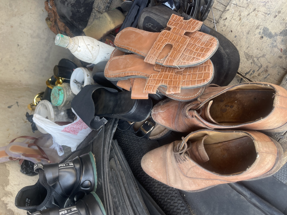 The scene depicts a collection of footwear and miscellaneous items arranged on a worn surface, possibly a wooden platform, against a light-colored wall in Dzhidu, Nigeria