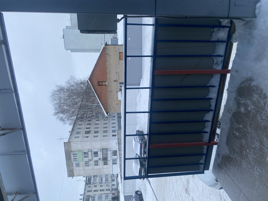 The image displays an exterior urban scene in Chaikovsky, Russia, under an overcast sky with widespread snow cover. In the immediate foreground, a snow-dusted concrete or paved surface transitions to a dark blue metal railing and a partially visible dark gray/blue sliding gate, both exhibiting accumulated snow at their bases. The gate incorporates vertical red structural elements. Beyond the gate, a snow-covered open area or parking lot contains three vehicles: two dark-colored sedans, heavily covered in snow and facing away from the viewer, and a light-colored SUV partially visible on the far left. A low, light-colored panel fence runs horizontally behind these vehicles. In the midground, a two-story building with light yellow brick walls and a red brick gable roof features a small, dark, rectangular window in its gable end and a yellow gas line visible on its exterior. A large, bare deciduous tree stands between this brick building and the background structures. The background reveals several multi-story residential apartment buildings: one on the left with a light facade and multiple balconies, including one with a light green front; another similar building partially obscured; and a taller, lighter-colored multi-story building on the far right. No individuals are present in the scene, and no active events are depicted.