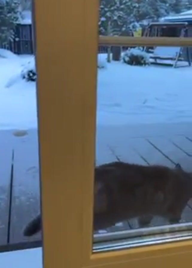 gray tabby cat walking onto a wooden porch covered in snow, seen through a glass door. The cat initially enters the frame from the left, coming from inside the house, and moves onto the porch. The background shows a snowy yard with trees, a fence, and a swing set partially covered in snow. Light snowfall can be observed. The camera's perspective is from inside the house, looking out through the glass door. Someone is speaking in the background. A colorful object resembling a toy is visible on the porch near the bottom of the frame.