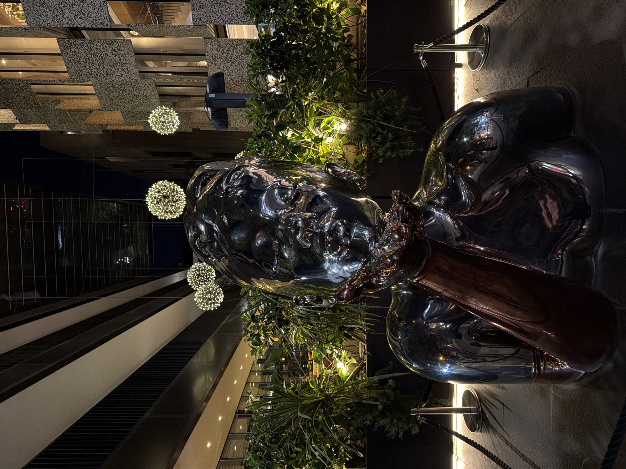 A nighttime outdoor view of a shiny metal sculpture of a human head and torso in Tirana, Albania. The sculpture is placed among lush greenery and illuminated by string lights within the plants. The backdrop includes modern architectural buildings with alternating black and white striped facades, lit windows, and decorative spherical lights suspended in the air. Security stanchions with black ropes are visible near the sculpture.