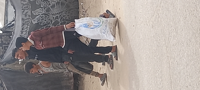 Three young males are depicted walking from left to right on a light-colored, possibly dirt or gravel path, in the city of Khan Yunis, Palestinian Territory. The leftmost boy, younger in appearance, wears a light-colored tank top, light brown pants, and gray closed-toe shoes, carrying a dark bag over his left shoulder. The middle boy wears a black hoodie with a white "GIVENCHY" logo, black track pants with white side stripes, and dark striped slide sandals. The rightmost boy wears a maroon collared long-sleeve shirt, black track pants with white side stripes, and dark striped slide sandals; he carries a large white sack with a blue and gold wheat sheaf logo and Arabic text "المَنَارَة" (Al-Manara) in his right hand. In the background, a dark-colored fabric or tarp with a prominent white floral pattern serves as a wall for a makeshift structure. Other indistinct structures are visible beyond. The scene is illuminated by natural daylight.