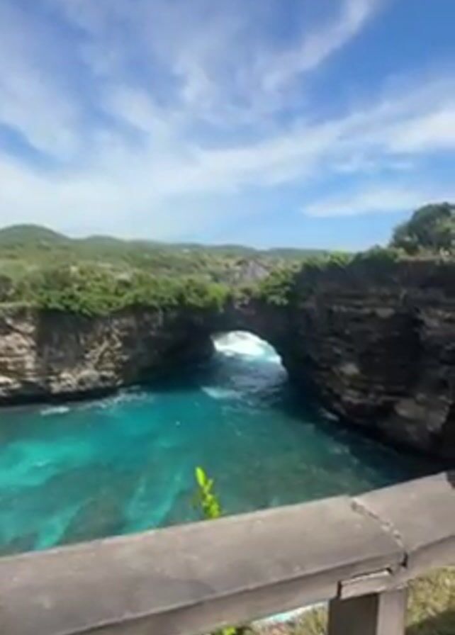 view of a natural stone arch over the ocean. The arch is formed by dark rocky cliffs covered in green vegetation. The water under the arch is a bright turquoise color with white foam from the waves. In the background is a green hilly landscape and a blue sky with scattered clouds. A wooden fence is visible in the foreground, partially obscuring the view. The camera is static.
