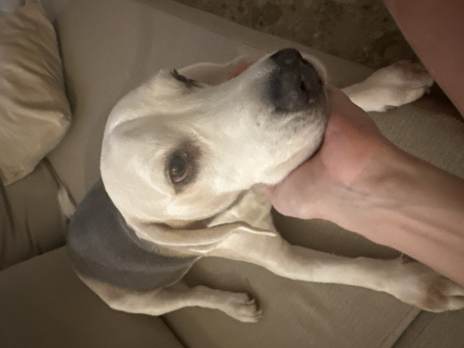The scene, located in Rishon LeZion, Israel, depicts an indoor environment. A bicolored dog, possessing a prominent gray-blue saddle marking on its back and predominantly white/cream fur on its head, legs, and underbelly, is lying down on a light beige fabric sofa. The dog exhibits dark brown eyes with subtle reddish-brown discoloration beneath them, and a dark, moist-looking nose with minor light flecks. A light-skinned human hand, exhibiting visible veins, is positioned under the dog's chin, gently supporting or petting it. In the background, a light-colored throw pillow rests on the sofa. A glimpse of light-colored tiled flooring is visible in the lower right foreground. The overall lighting is consistent with indoor artificial illumination.