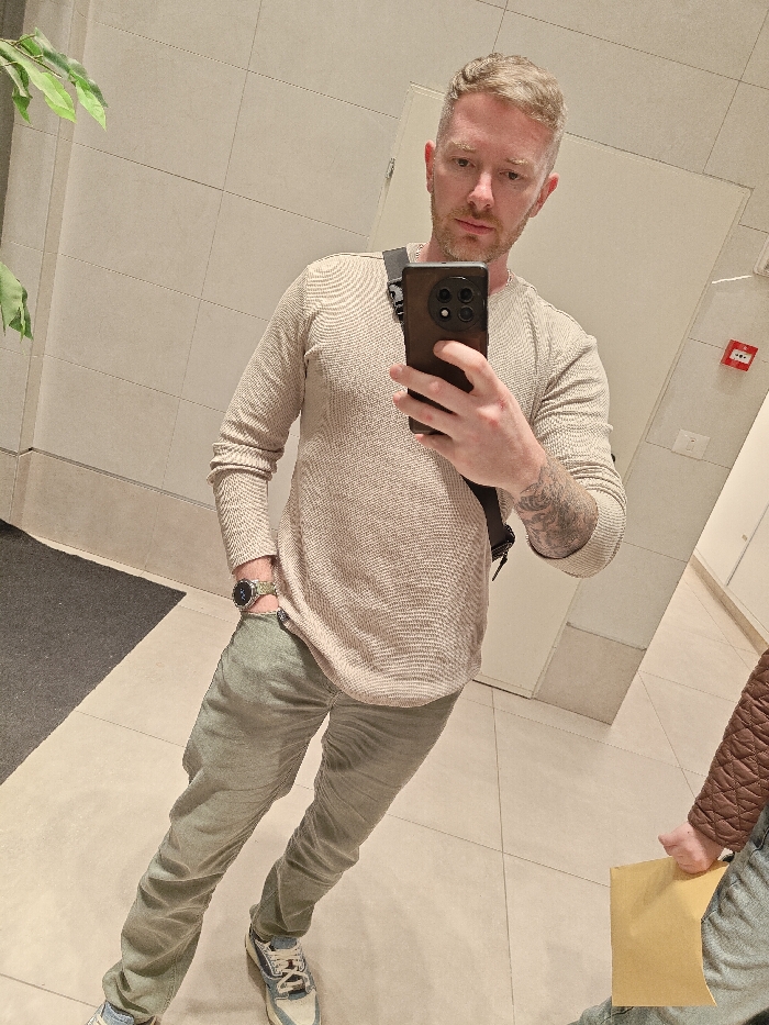 A man stands in a tiled room, holding a phone to take a selfie. He wears a beige long-sleeved shirt, gray pants, and patterned sneakers. A black bag strap crosses his body. He has short blonde hair and a light beard. A watch is visible on his left wrist. Part of a green plant is in the background on the left. Tiles cover the walls and floor, with a section of dark gray flooring also visible. Another person, partially visible on the right, holds a yellow paper.