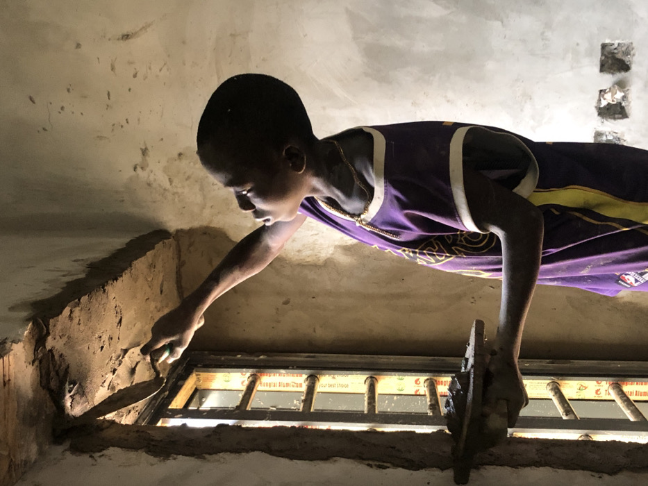 An individual with dark skin, wearing a purple shirt with white and yellow trim and a gold-colored chain, is actively applying mortar to the interior wall above a window in Enugwu-Ukwu, Nigeria