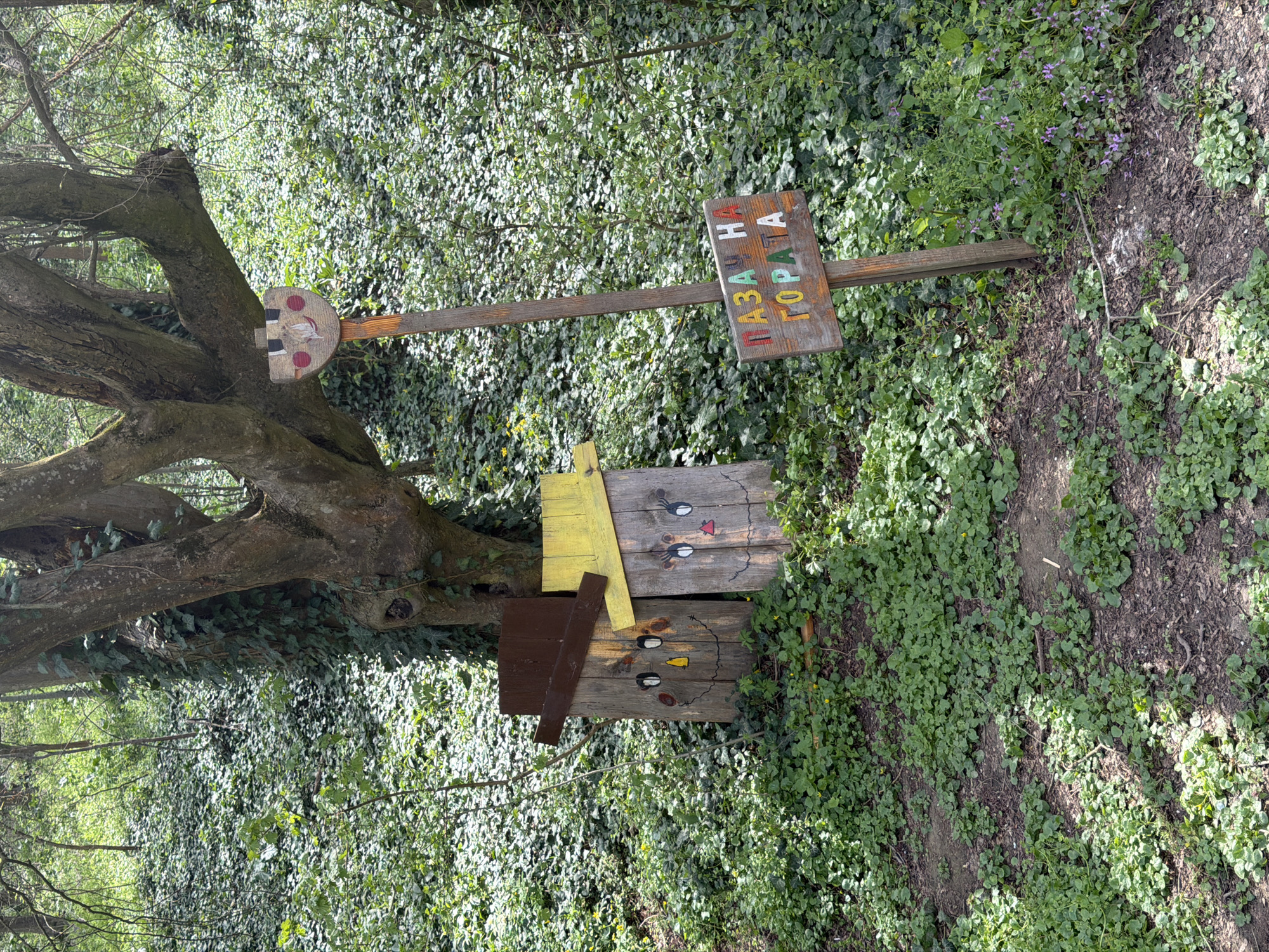 woodland scene in Petrevene, Bulgaria. In the center stands a wooden post with a sign reading "PAZI NA GORATA" in colorful letters, translating to "Protect the Forest." Attached to the post is a whimsical, folk-art style construction. This includes a circular face with painted features mounted at the top, followed by two small, wooden birdhouses stacked on top of each other. Each birdhouse is decorated with simple painted eyes and beaks, giving them a cartoonish appearance. The surrounding environment consists of dense green foliage, with ivy crawling up the base of the post and around the birdhouses, obscuring sections of the forest floor. The scene is captured in daylight, suggesting an outdoor setting within a park or wooded area in Petrevene.