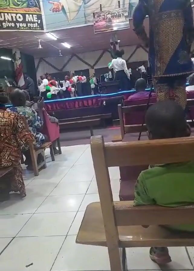 interior of what appears to be a church. The camera is positioned among the congregation, focusing on the performance stage. A choir, dressed predominantly in white tops, is on the stage, some holding balloons in red, green, and white. A person dressed in blue and gold traditional African attire stands tall near the camera’s perspective. There are wooden chairs where the congregation is seated, with individuals wearing traditional clothing. A child in a green shirt is seated in the foreground, their back to the camera. Large religious posters are visible on the walls, including one of Jesus Christ. The church has a tiled floor and appears to be lit with overhead lights.